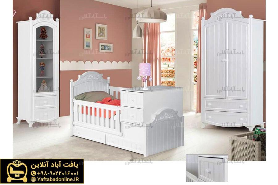 سرویس خواب نوزاد سیلور، ساده، شیک و در عین حال مدرن است که این سادگی سبب سِت شدن این مدل با دکوراسیون های مختلف می شود. این سرویس خواب از MDF درجه یک با روکش وکیوم تولید می شود که از استحکام بالایی برخوردار است. تخت خواب این مدل دو منظوره بوده که امکان تغییر سایز تخت متناسب با رشد نوزاد بر روی آن وجود دارد. سرویس خواب نوزاد سیلور شامل تخت خواب، کمد و ویترین است که اتاق خواب کودک شما را به راحتی کامل می کند. از ویژگی های دیگر این سرویس خواب می توان به وجود کشو های بزرگ و جادار بر روی تخت خواب و کمد اشاره کرد. سرویس خواب نوزاد سیلور را با رنگ دلخواه، ضمانت ۱۲ ماهه یافت آباد آنلاین و خدمات پس از فروش ۵ ساله از ما بخواهید.